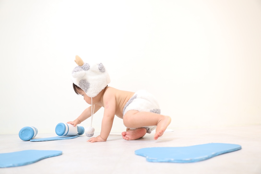 ハイハイでミルク瓶を拾っているのも愛らしいフォルムです!
