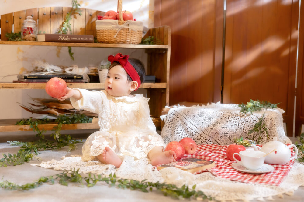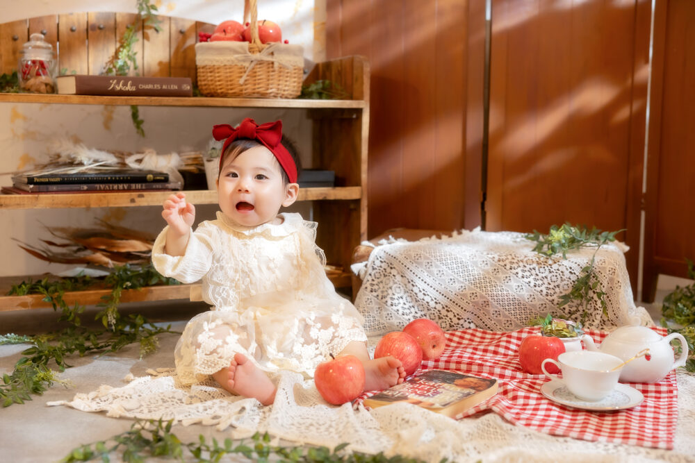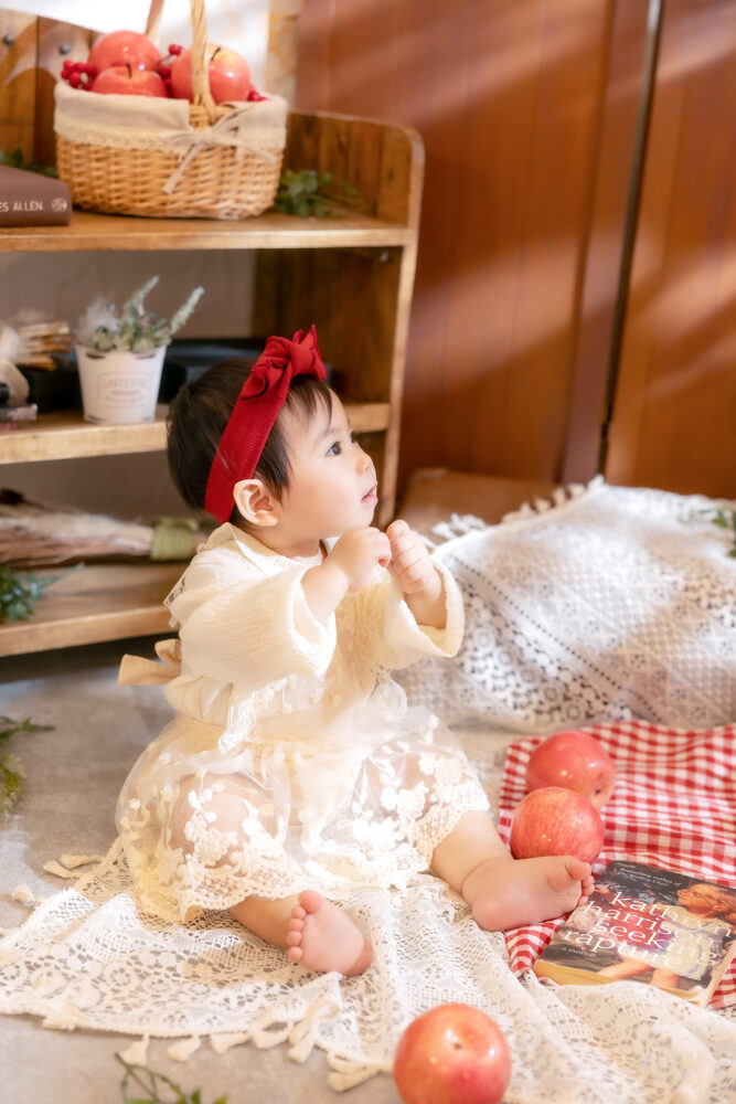 新たなベビー撮影のご提案! カントリー調のセットのレースを基調としてドレスでまるで欧米のお嬢様。 お庭で苺をつんで、紅茶の飲みながら読書をする、そんな優雅な午後のまったりとした時間を過ごしているかのようなビジュアルです。 暖かな木漏れ日に照らされて素敵なひとときはいかが?