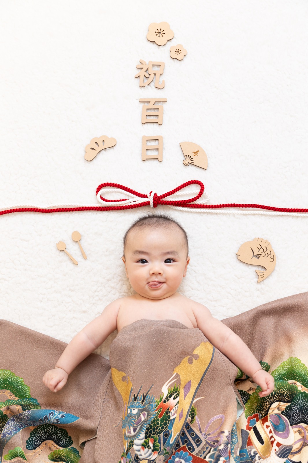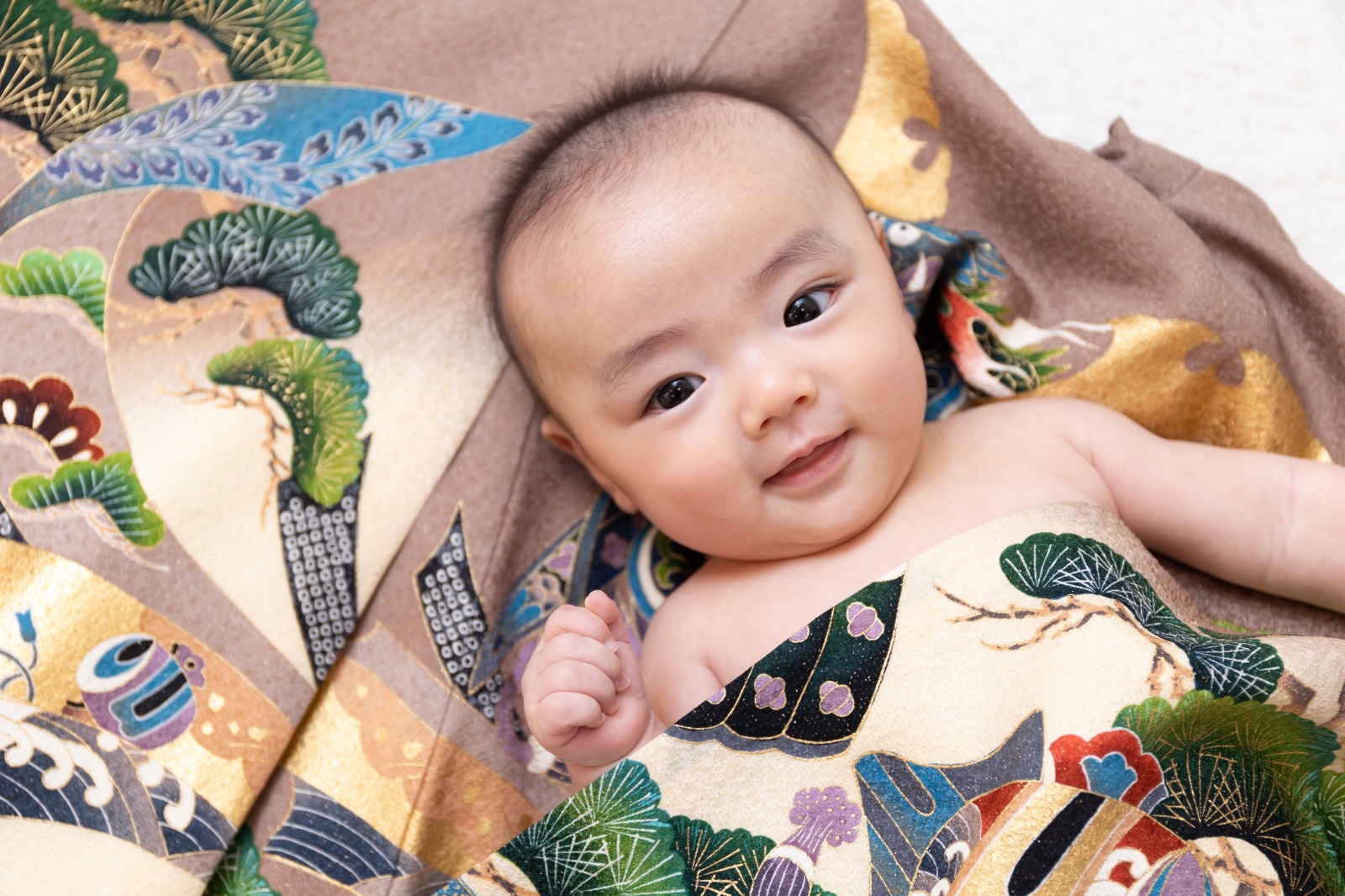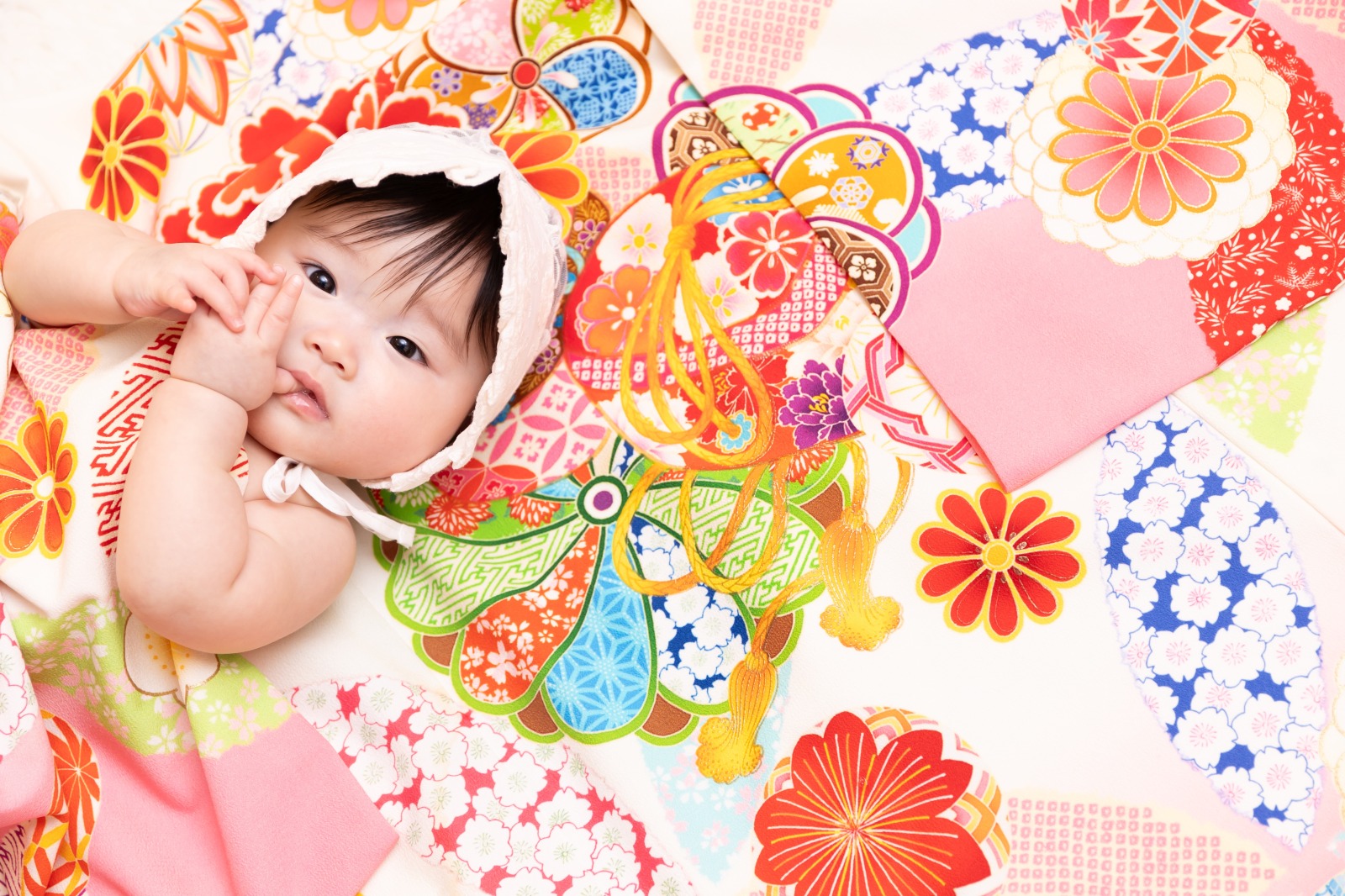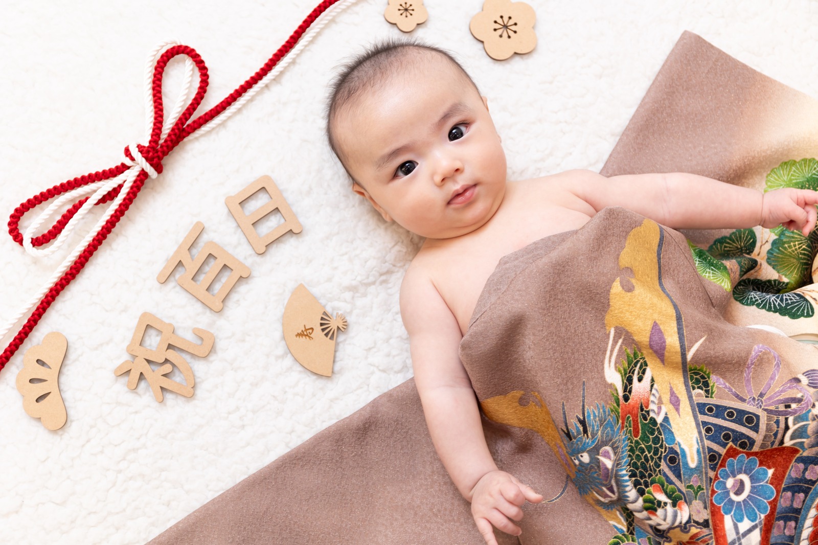 お着物を1着お好きなのを選んでいただき、お布団のように赤ちゃんにかけてあげお祝いの象徴水引をあしらったスタイル、もしくは着物の上に寝転んだりお袖の中に入ったスタイルの2種類があります!