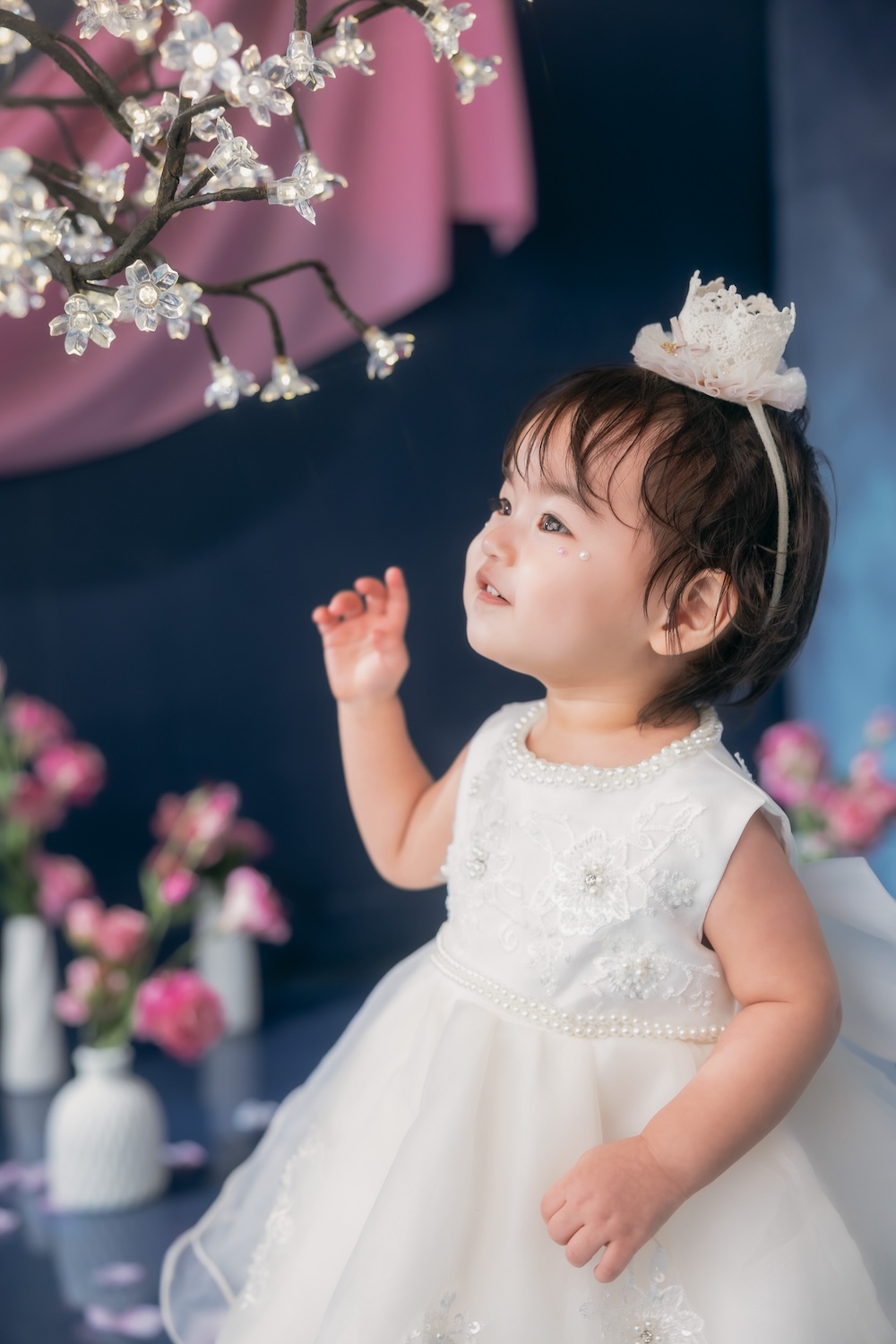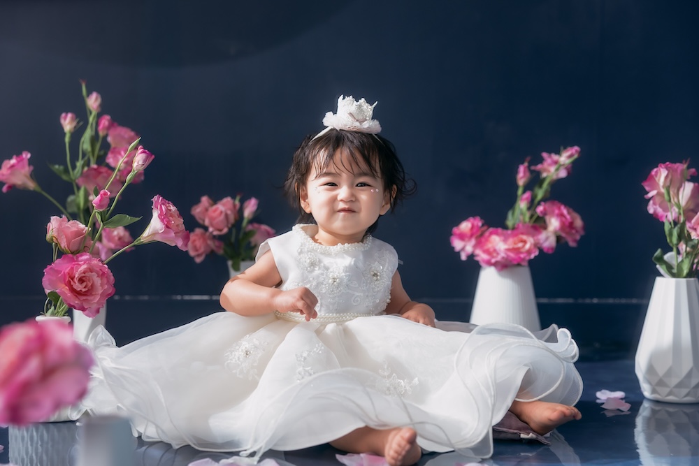 ネイビーの背景とピンクの花を合わせた上品なスタジオセットで撮影したベビーフォト。ホワイトのチュールドレスを合わせた、洗練された雰囲気のプレミアベビー撮影をご紹介します。