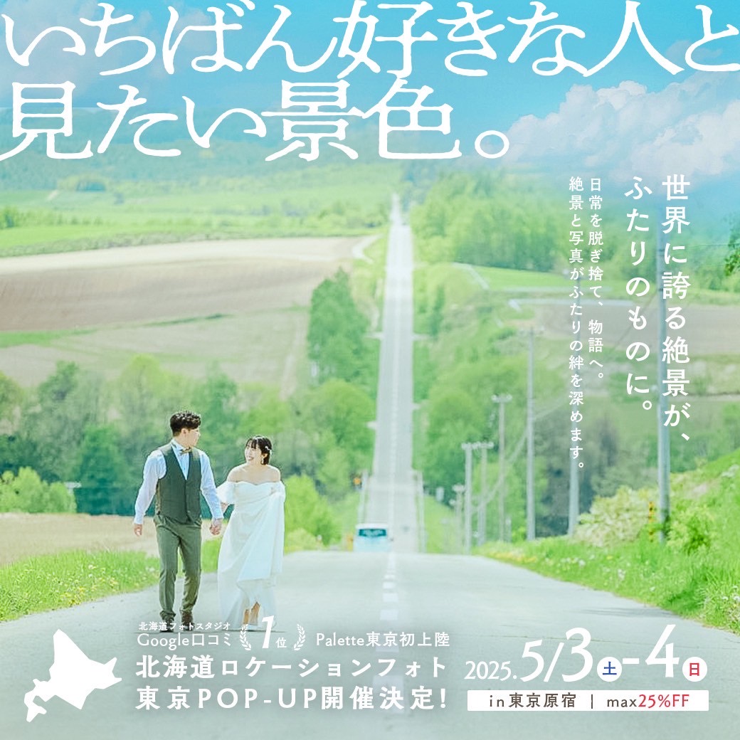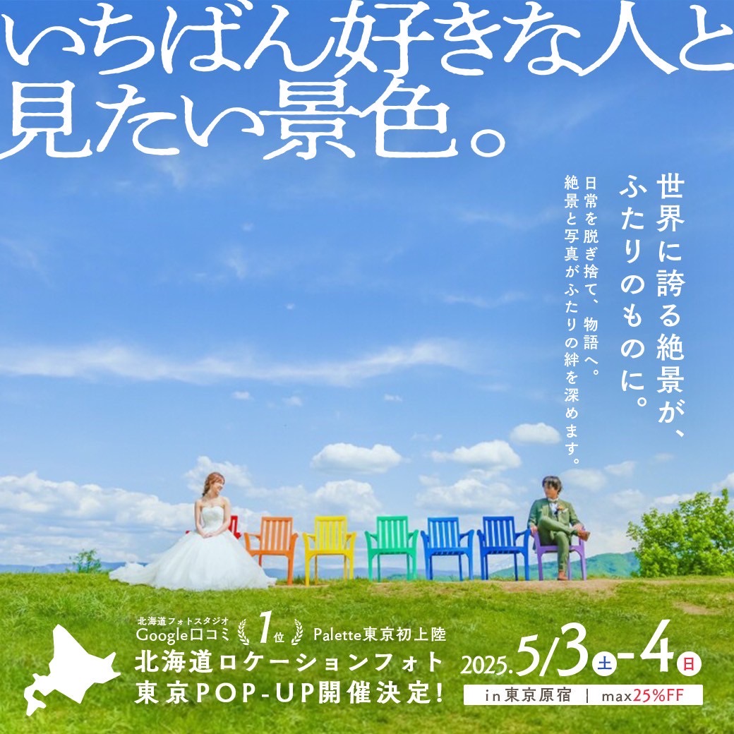 北海道のフォトスタジオPaletteが東京初上陸!!! 北海道ロケーションフォトのPOP-UPを行うことが決定いたしました˚✧₊ 世界に誇れる、富良野・美瑛でのロケーションウェディングフォトを関東エリアでご相談・ご契約をいただくことができます!