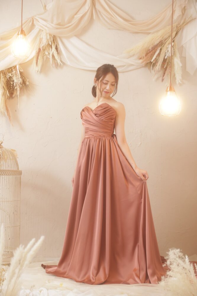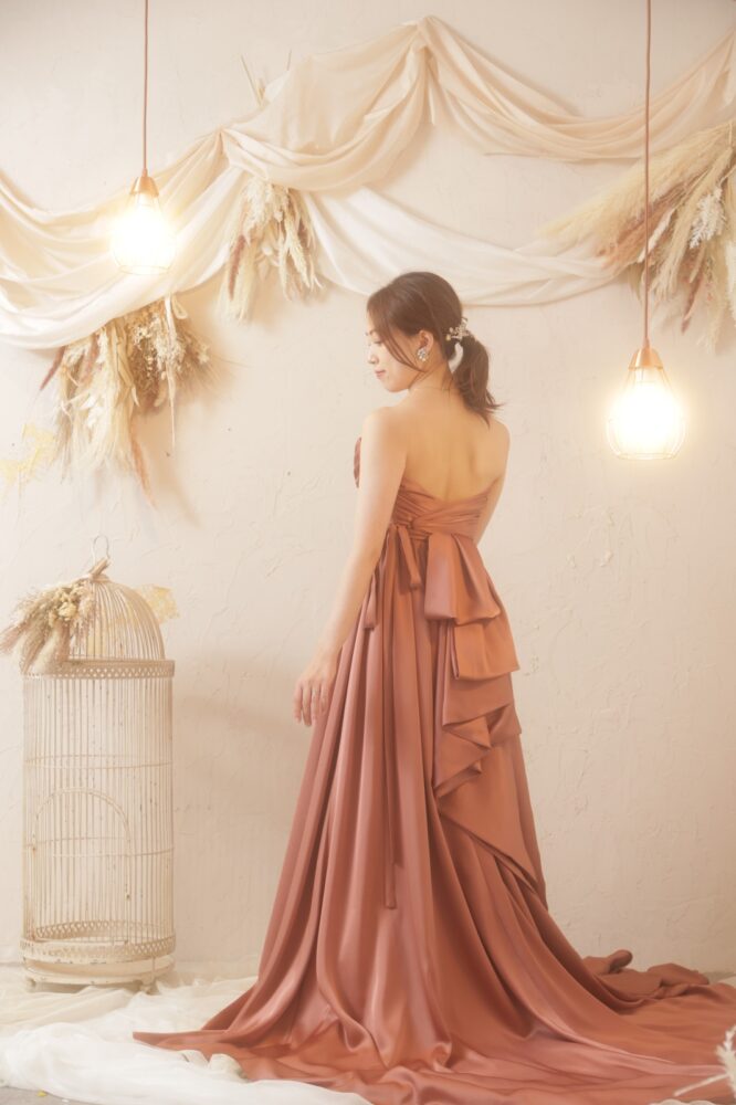 少し濃いめのテラコッタカラーのドレスなのでお肌も明るく綺麗にみせてくれます!
