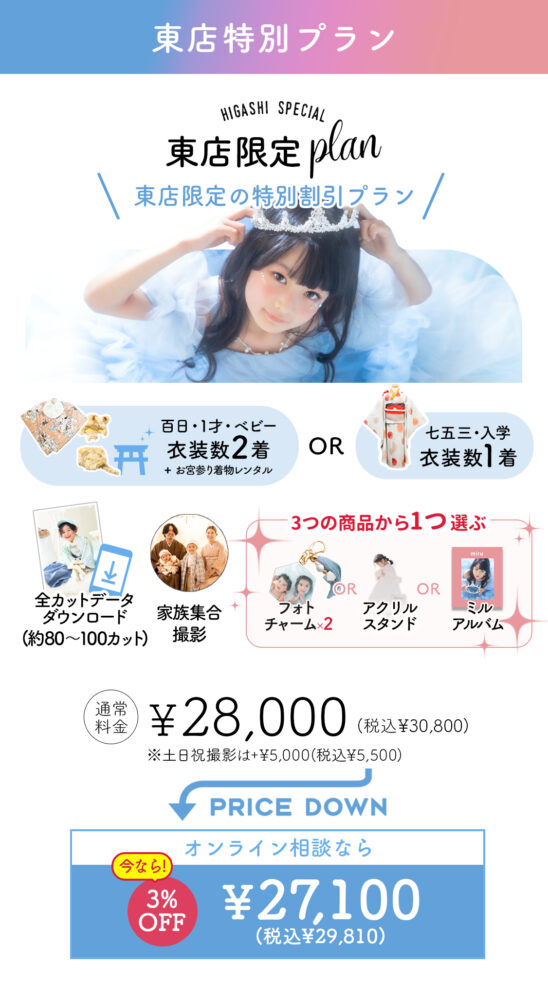営業時間に伴い、最後17時の枠が1時間のみとなりますので、【東店限定プラン】【ファミリーフォト】の2プランのみのご案内とさせて頂きます。