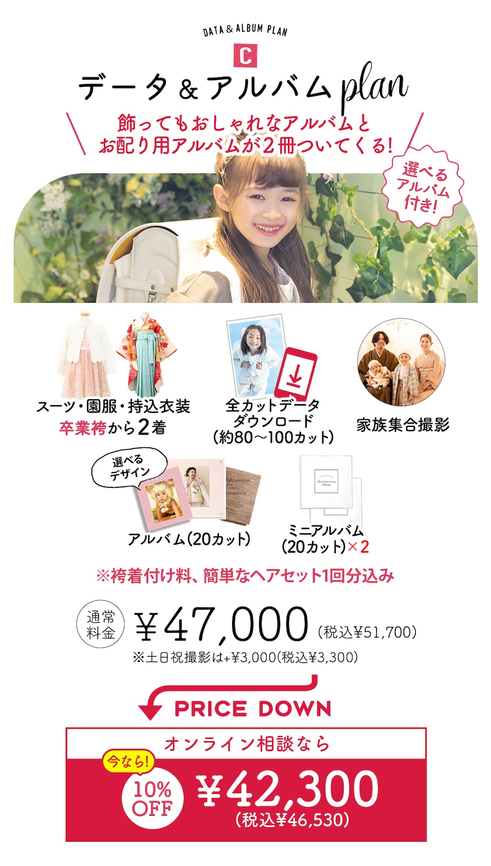 袴込みの2着撮影が可能なプランはライトプラン、データ&アルバムプラン、福袋プラン、プラスプランです!