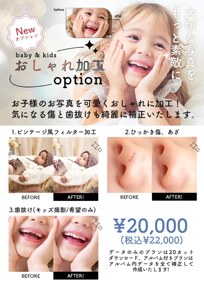 「歯が抜けているから撮影を先延ばしにしようかな…」と迷っているママも、このオプションがあれば「今」のベストな姿を安心して残せますよ。