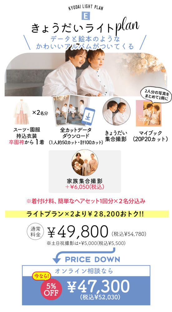 きょうだい集合撮影が含まれます 。(家族集合撮影は追加¥6,050(税込)で撮影可能)