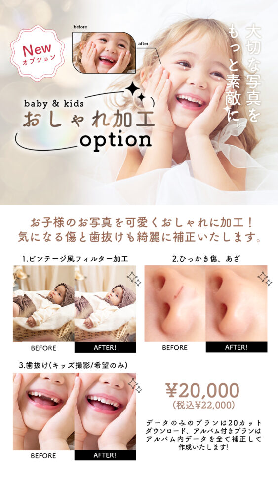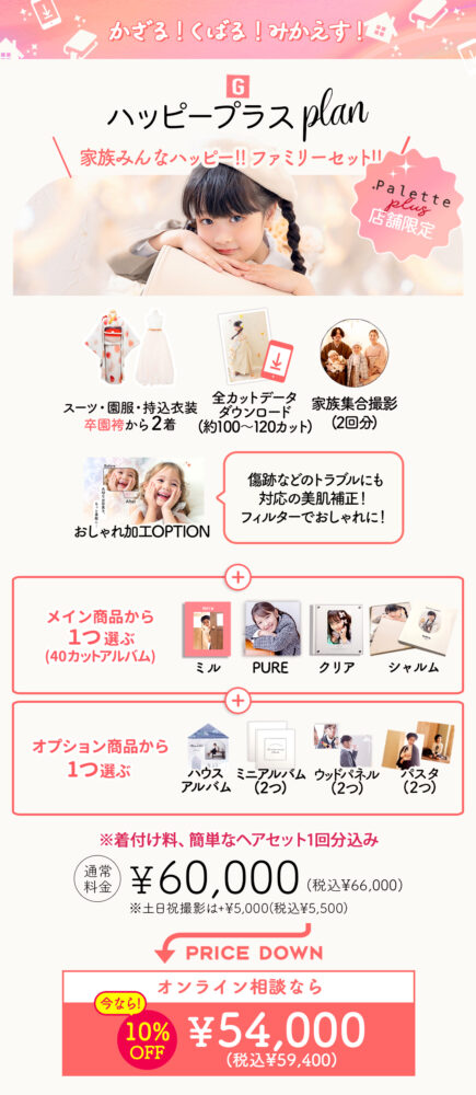 さらに豪華な内容を求める方には、おしゃれ加工オプションや選べるオプション商品が増える「ハッピープラスplan(60,000円+税)」もおすすめです 。