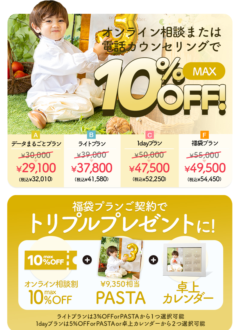 写真工房ぱれっと、Palette+plus全店舗で、家族みんなでW記念を一緒にお祝い。W記念のお写真を楽しみませんか?お誕生日の前後3週間以内での撮影で通常プランに特別な特典をプレゼント☆