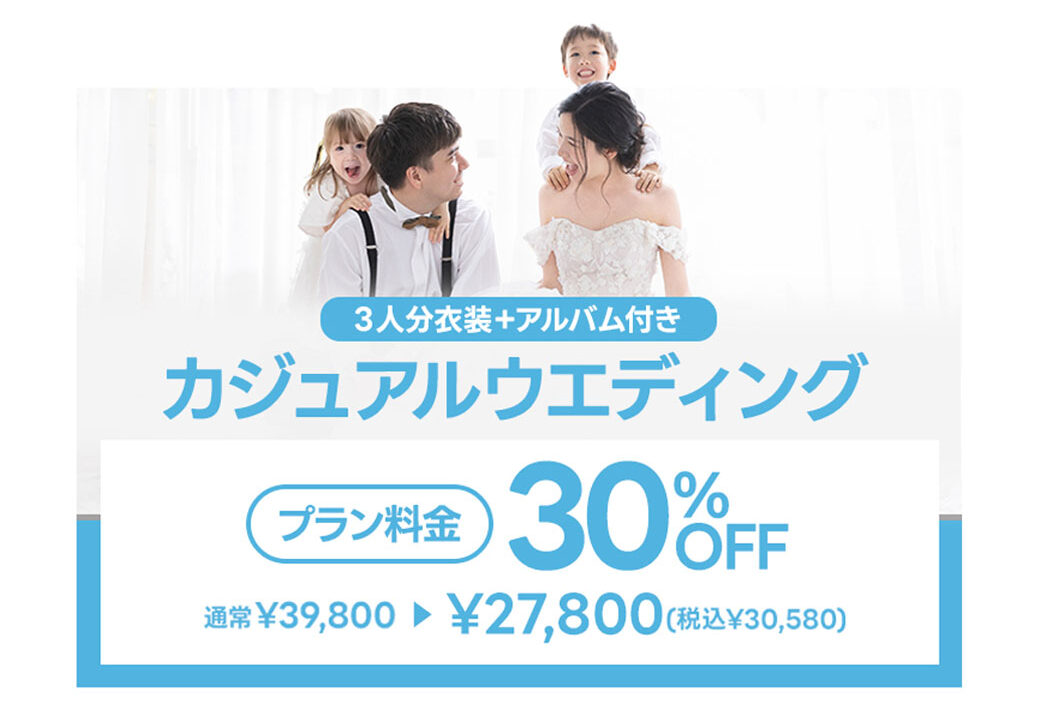 ・カジュアルウエディングフォトがスタート記念、プラン料金が30%オフ!