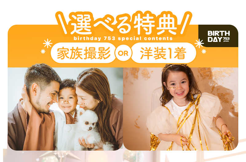 バースデー753のご案内! 3つの特典が通常の特典と併用で付けられます! ご主役の誕生日から前後3週間以内での撮影で特典が付けられますよ!