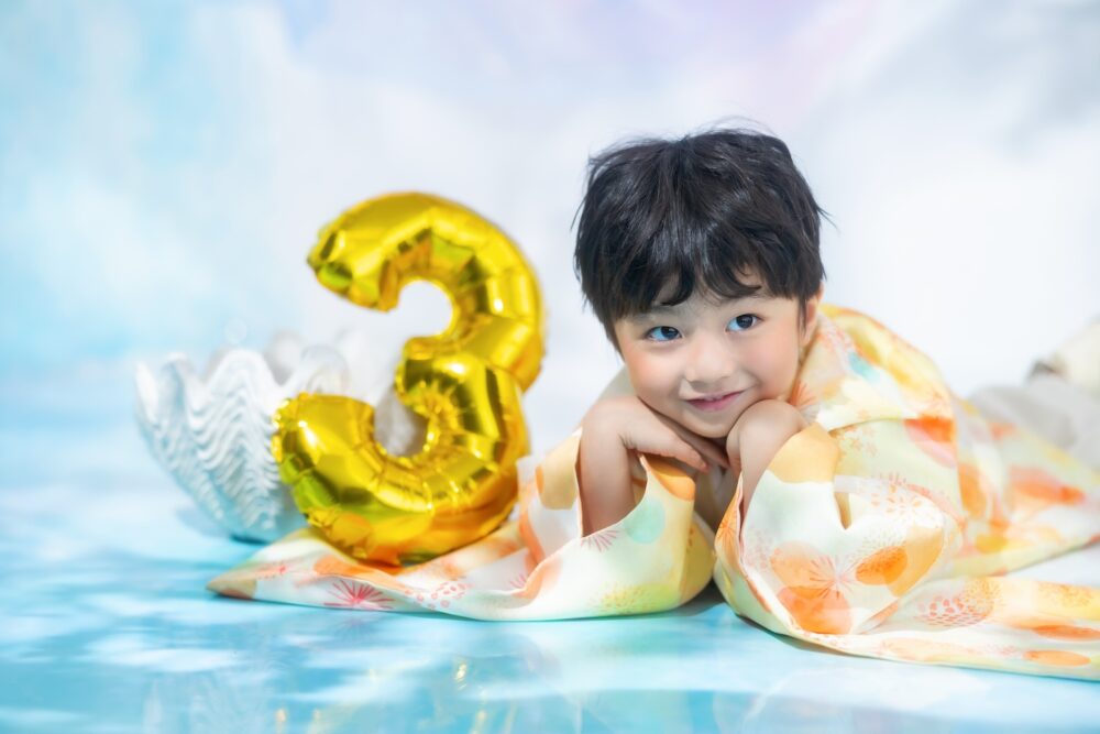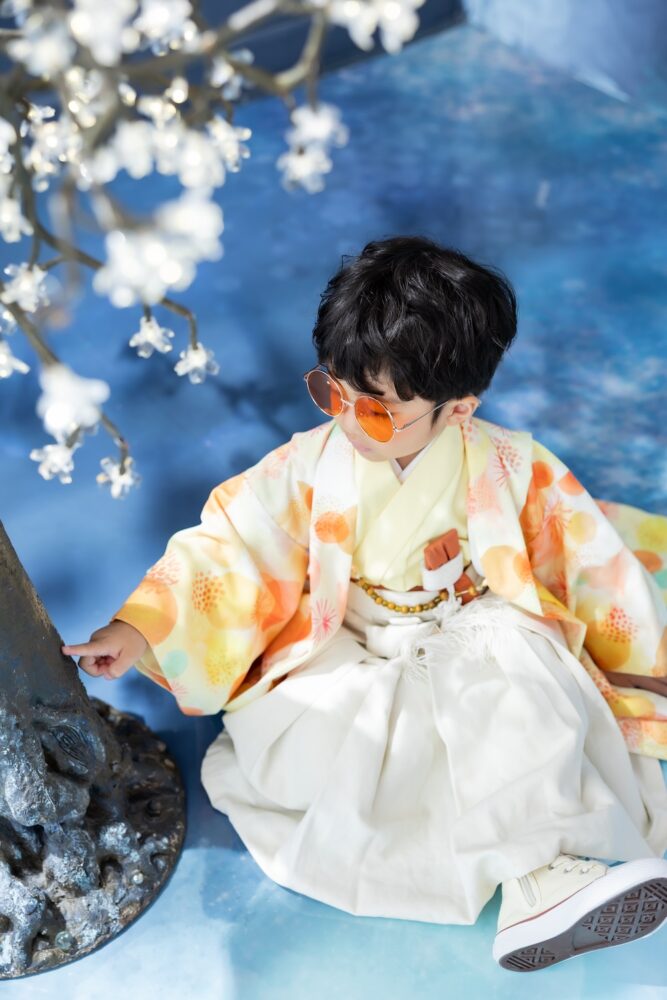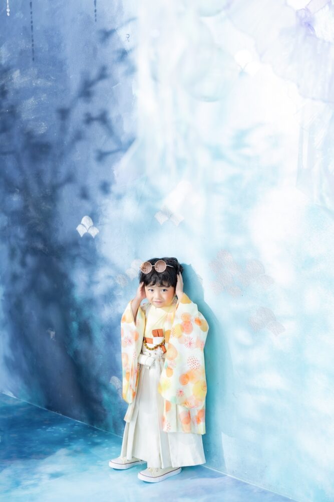 北海道札幌市東区にあるベビーキッズフォトスタジオ、palette+Plus札幌東店です。 東店より七五三の新しいビジュアルが登場いたしました! kirakiraスタジオビジュアルで1番の人気を誇るSunglassesの3歳男の子バージョンです! 爽やかな青色の背景にオレンジ色の着物が映えるとっておきのビジュアルです♪