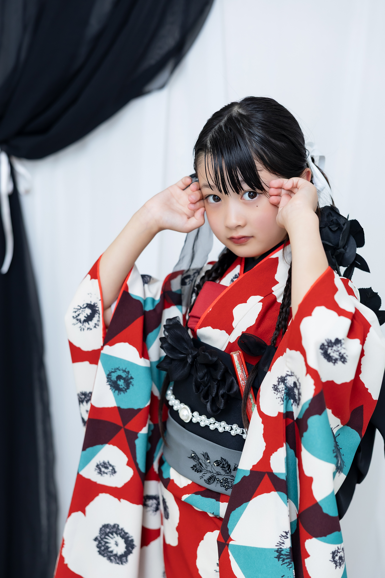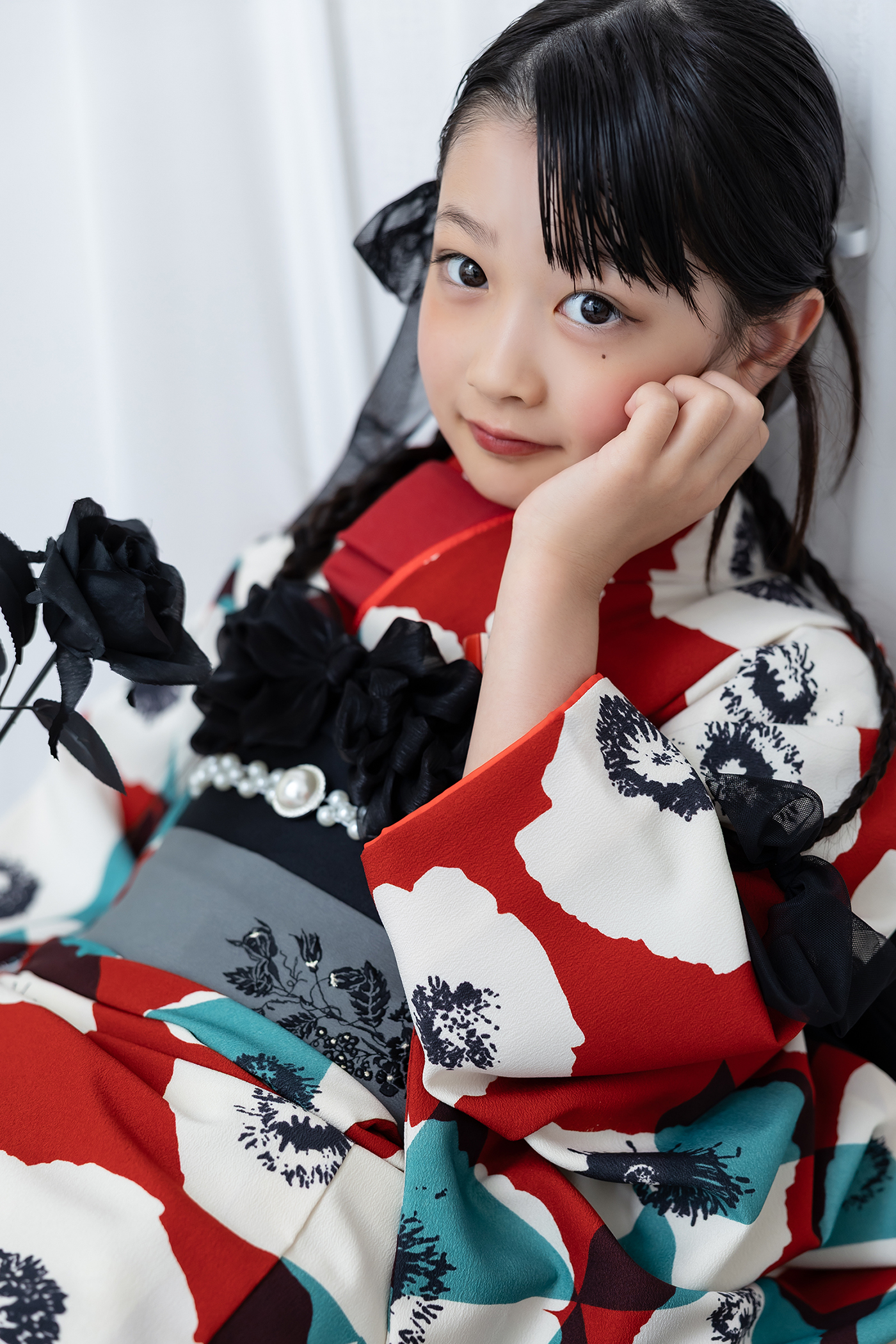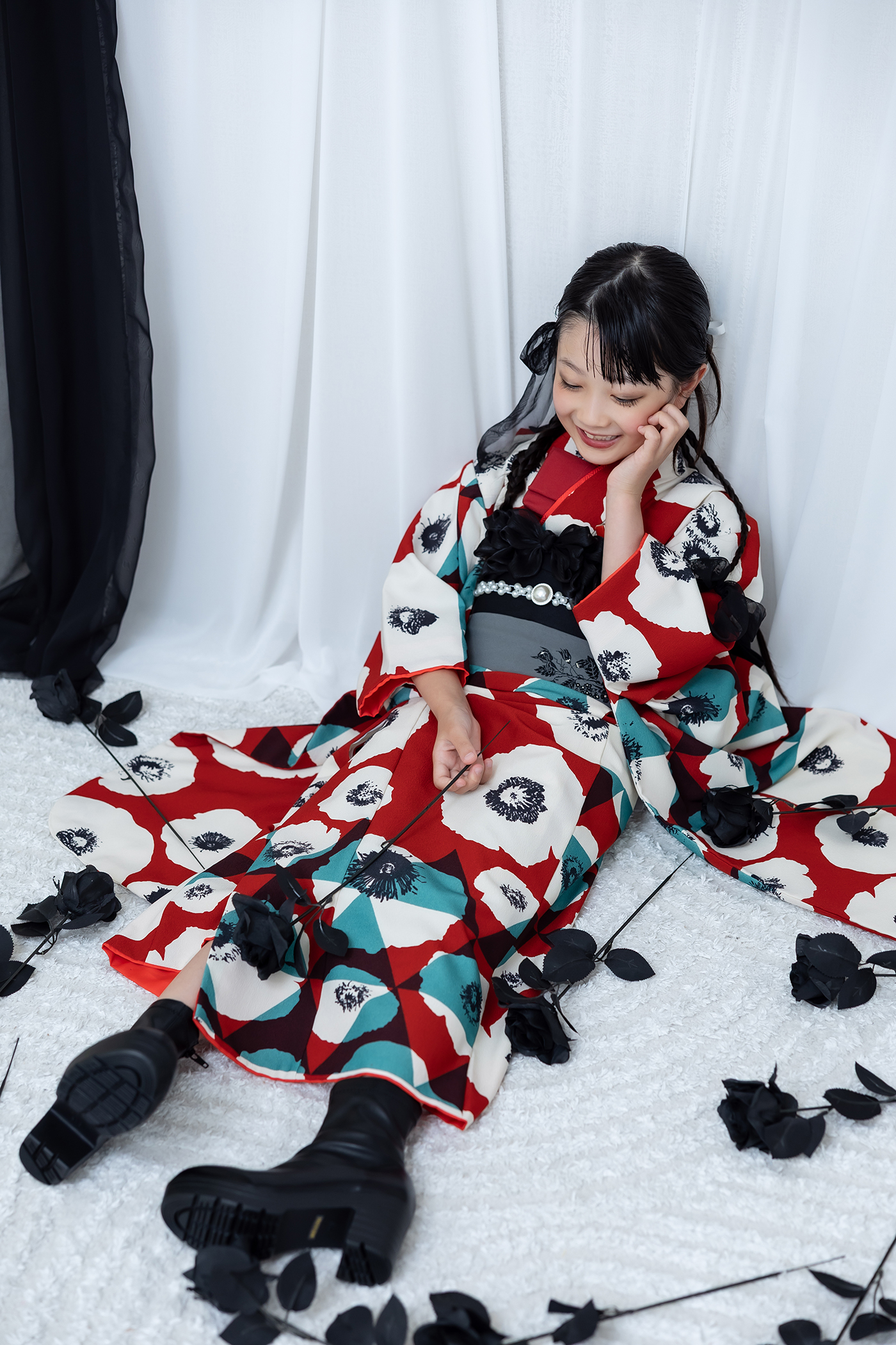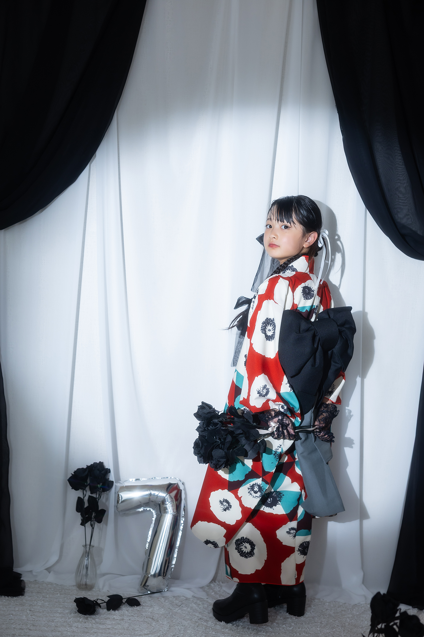 今回は赤いお着物を着用していていますが、どんな色のお着物にも合う背景です。
