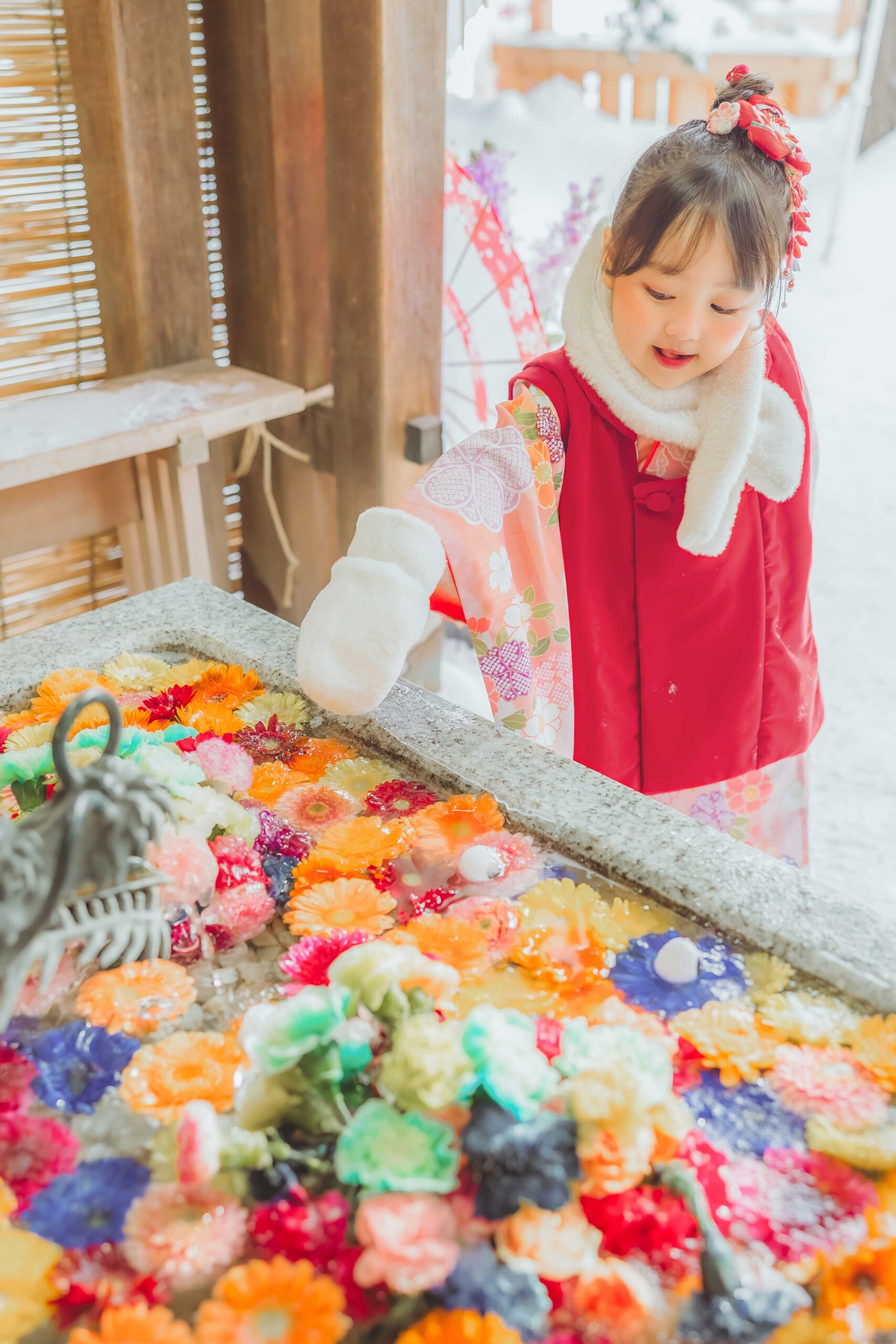 女の子はお花をあしらったお着物をご用意させて頂いております。