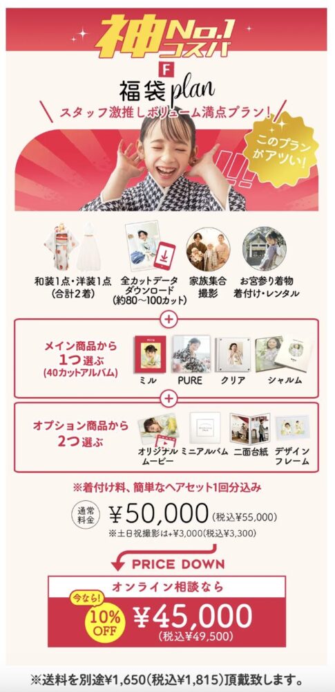 ぱれっとの七五三撮影は、全てのプランに衣装のレンタルや着付け、全カットデータが含まれております!