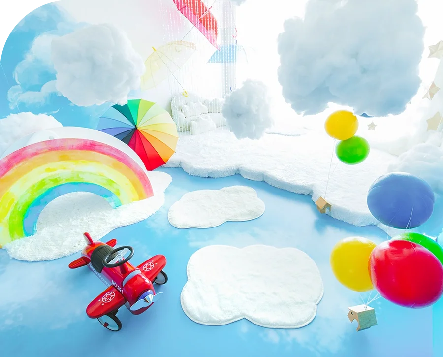 空をモチーフにしたスタジオで、ふわふわの雲や虹のすべり台がございます🌈