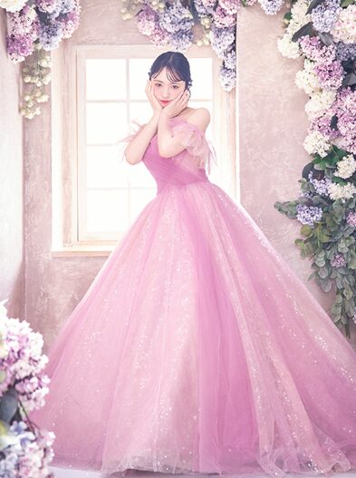 ウエディングドレスとは異なり、カラーバリエーションや素材の豊富さがポイントで、ピンク・レッド・グリーン・ブルー・グレーなど、個性や披露宴のテーマに合わせて自由に選べます。