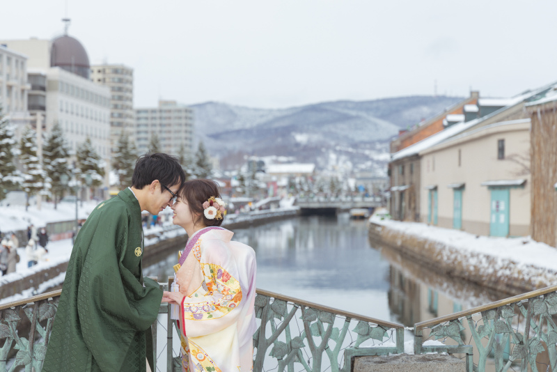 小樽の運河を背景にしたフォトウェディングは、オリジナルの思い出作りやSNS映えする写真を残したい方にぴったりです♪