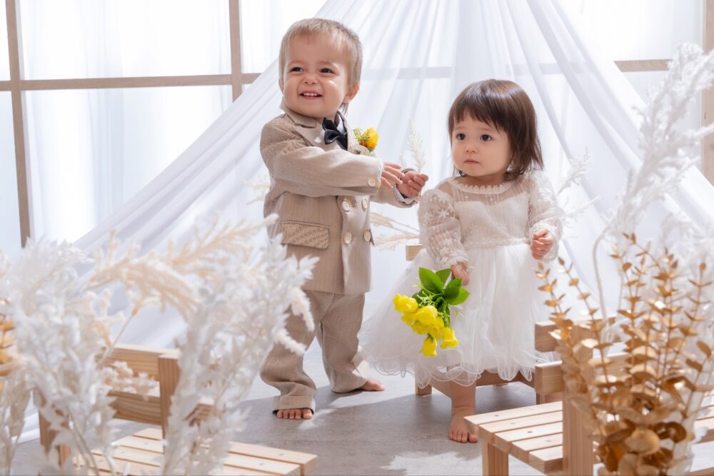 白無垢や色打掛、ウェディングドレスなどの本格衣装だけでなく、子ども用のドレスやタキシードも用意されており