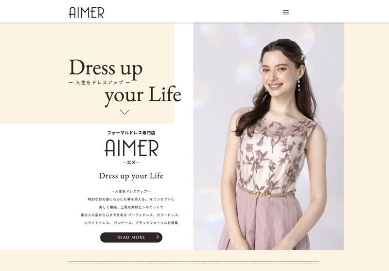 AIMERは、トレンド感と大人の可愛らしさをバランス良く取り入れ、日本女性の体型に合うパターンや着心地を大切にしているブランドです。ガーデンやレストランウエディングにも相性抜群で、上品さと親しみやすさを両立したスタイルが叶います。