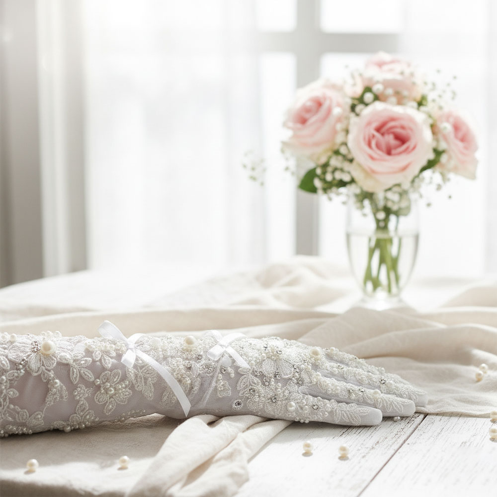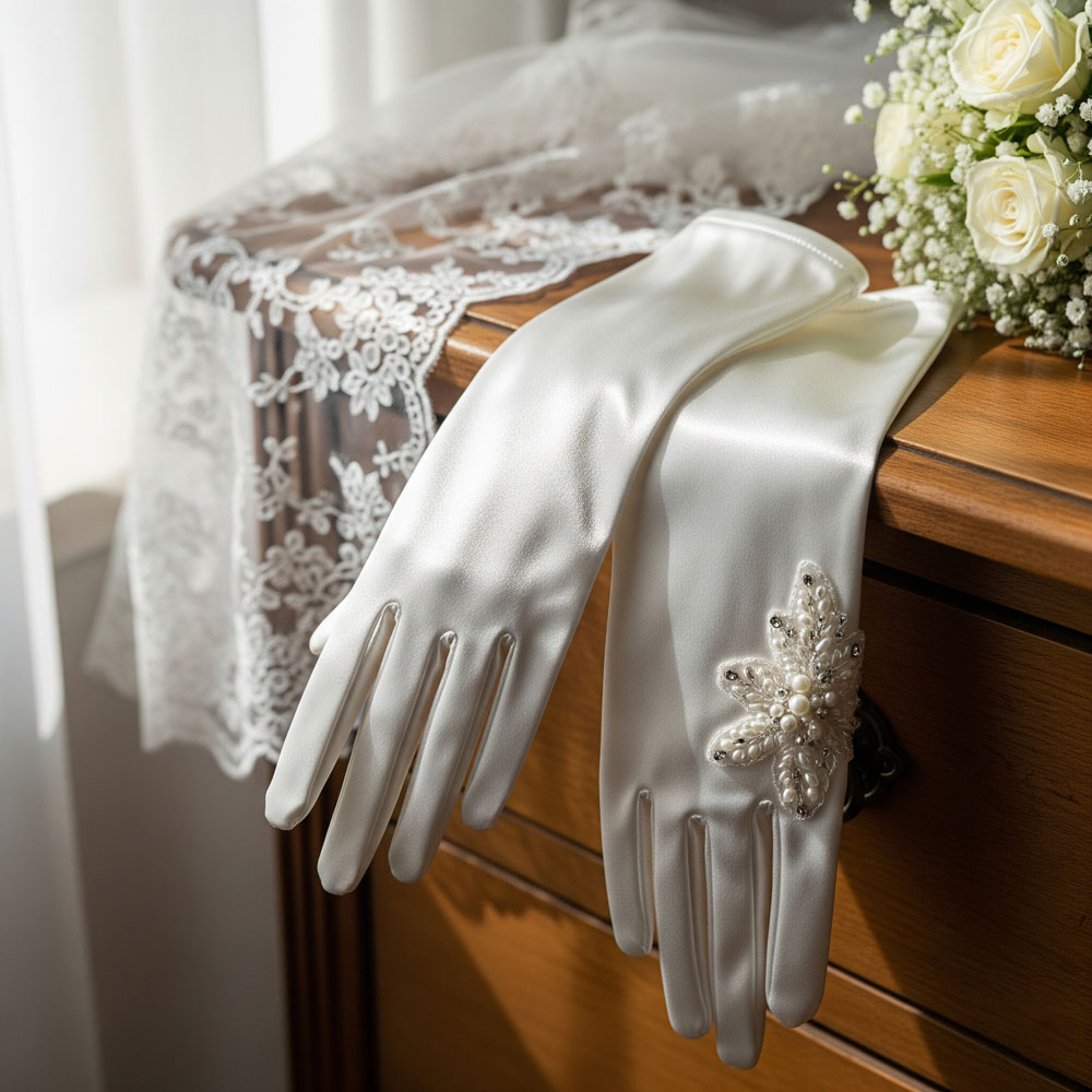 真っ白なサテンのグローブはフォーマルな場にもぴったりですし、繊細なレースやパール・リボンの装飾があるものは、華やかでおしゃれなアクセントとなります。
