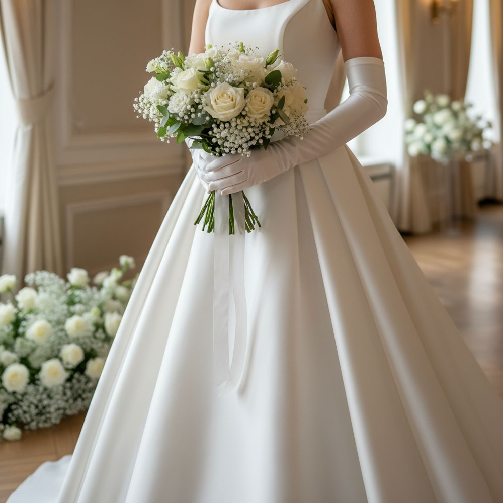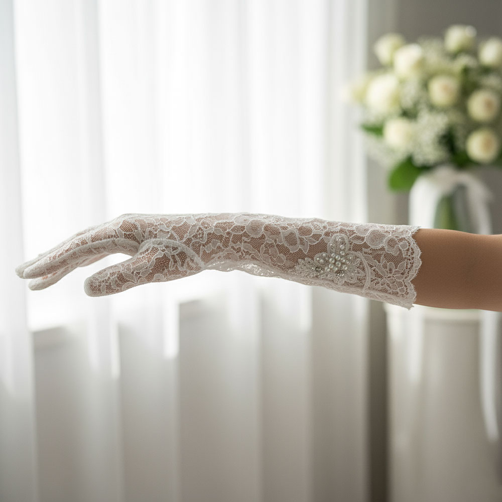 ドレスの素材やデザインに合わせてサテンやレース、オーガンジーのグローブを選ぶことで、透明感や柔らかさ、上品さが際立ちます。