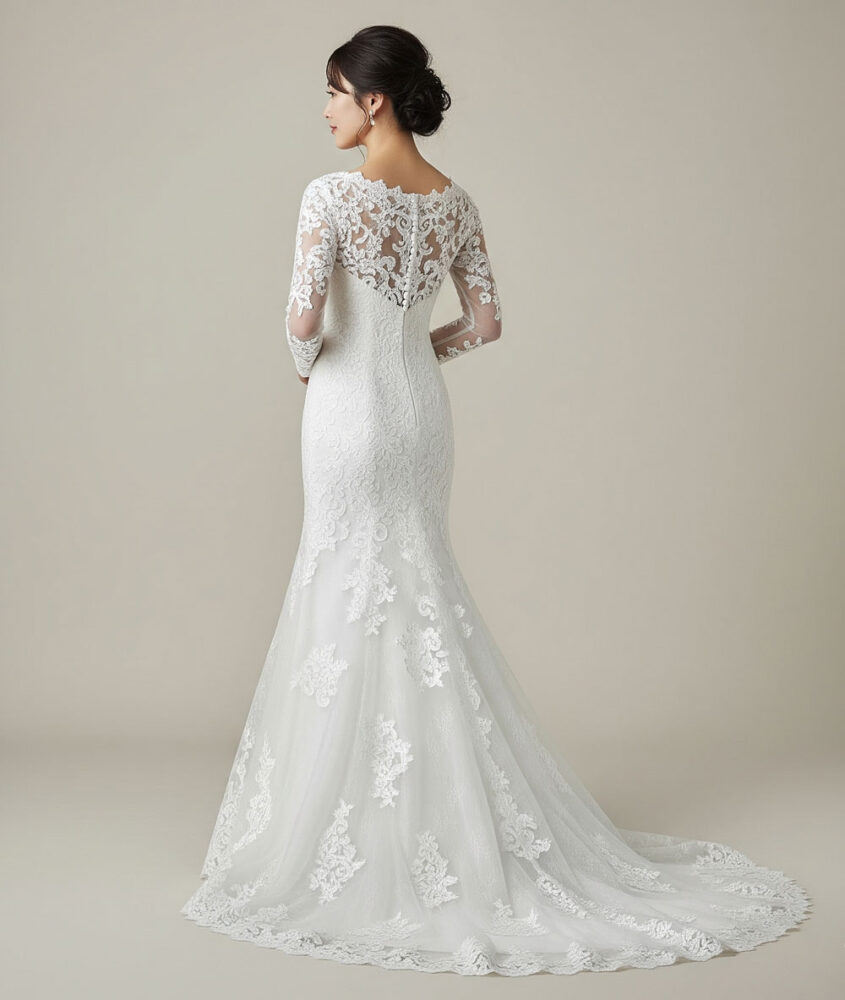 袖ありドレスは上品で知的な雰囲気が漂い、腕をカバーしつつもエレガントな印象をプラスしてくれます。特にレーススリーブや長袖タイプはクラシカルスタイルにもぴったりです。