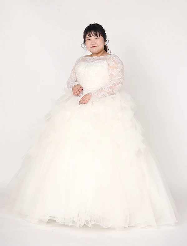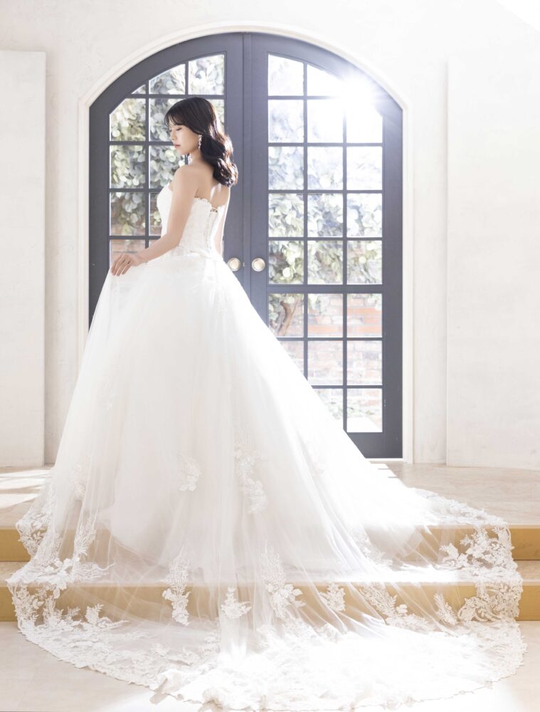 ロング丈のドレスはクラシカルでエレガントなイメージを与え、正統派な挙式や大きな会場によく合います。裾にトレーンがあるデザインは、一層高級感と華やかさが引き立ちます。