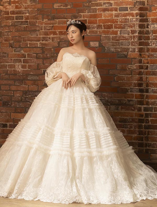 ボリュームのある裾や流れるような長いトレーンは、会場での存在感も映えて華やかさアップ。