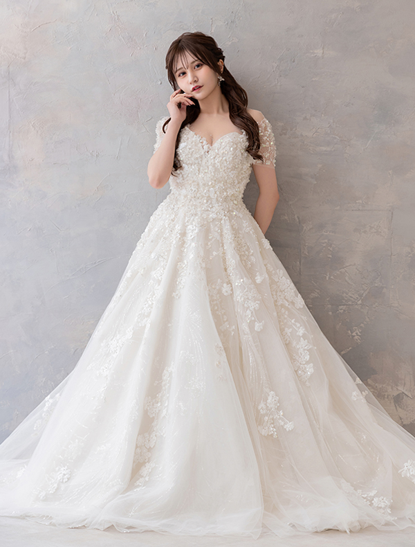 プリンセスラインドレスは、コンパクトな上半身とふんわりと広がるスカートのコントラストが美しく、華やかさと可憐さを同時に演出します。