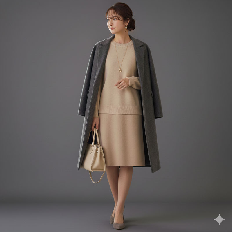 ワンピースやスーツなら、温かみのあるベージュやグレーなど冬らしいカラーが安心です。