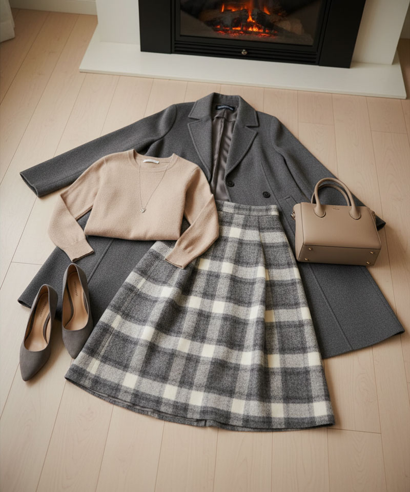 膝が隠れる丈や過度な装飾のないトップス、冷え対策も考えたアウターやニットの選び方が細やかな気配りとして伝わります。