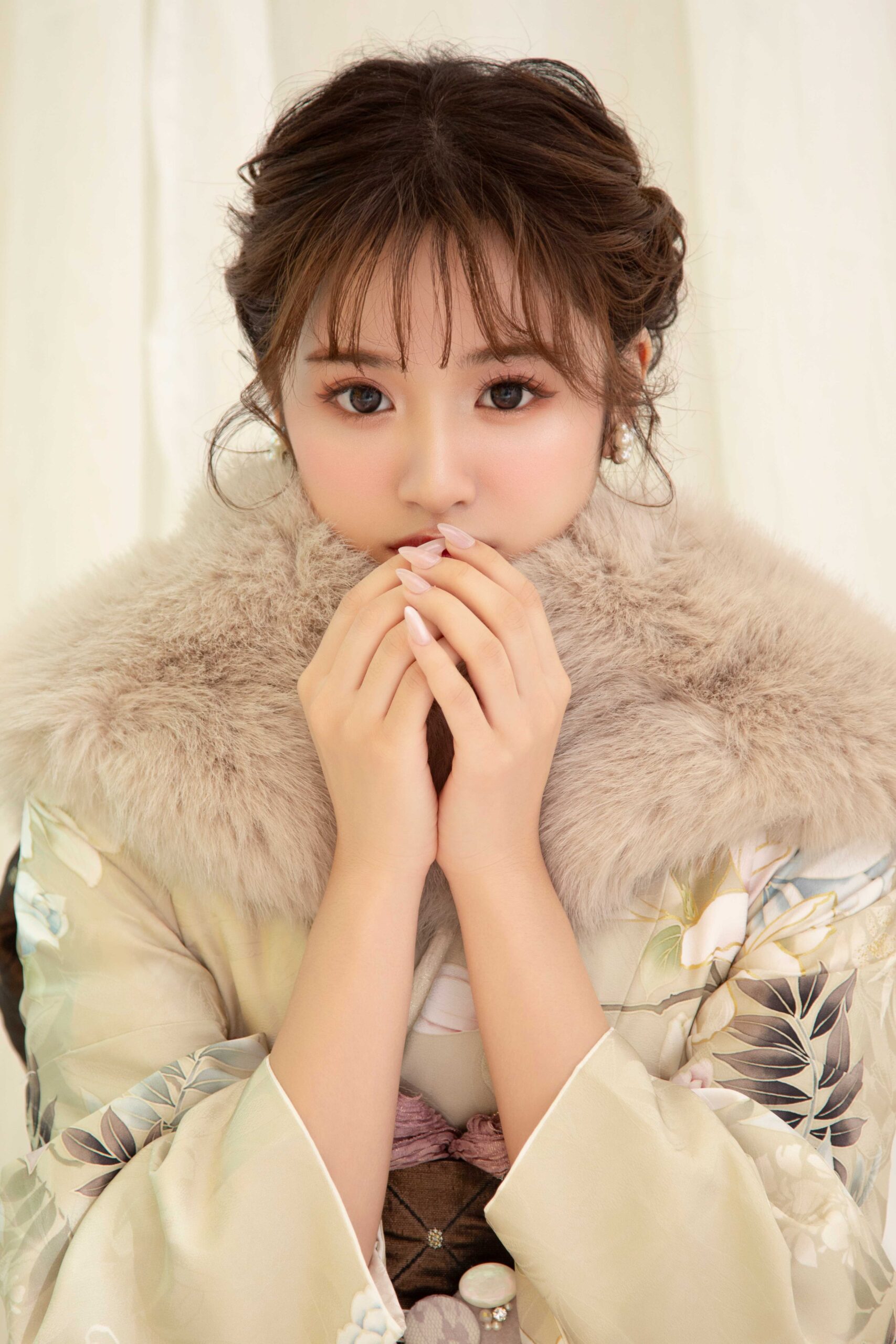顔の近くでポーズを作ったり、ショールに手を添えたり、振袖の袖を整えたり……。