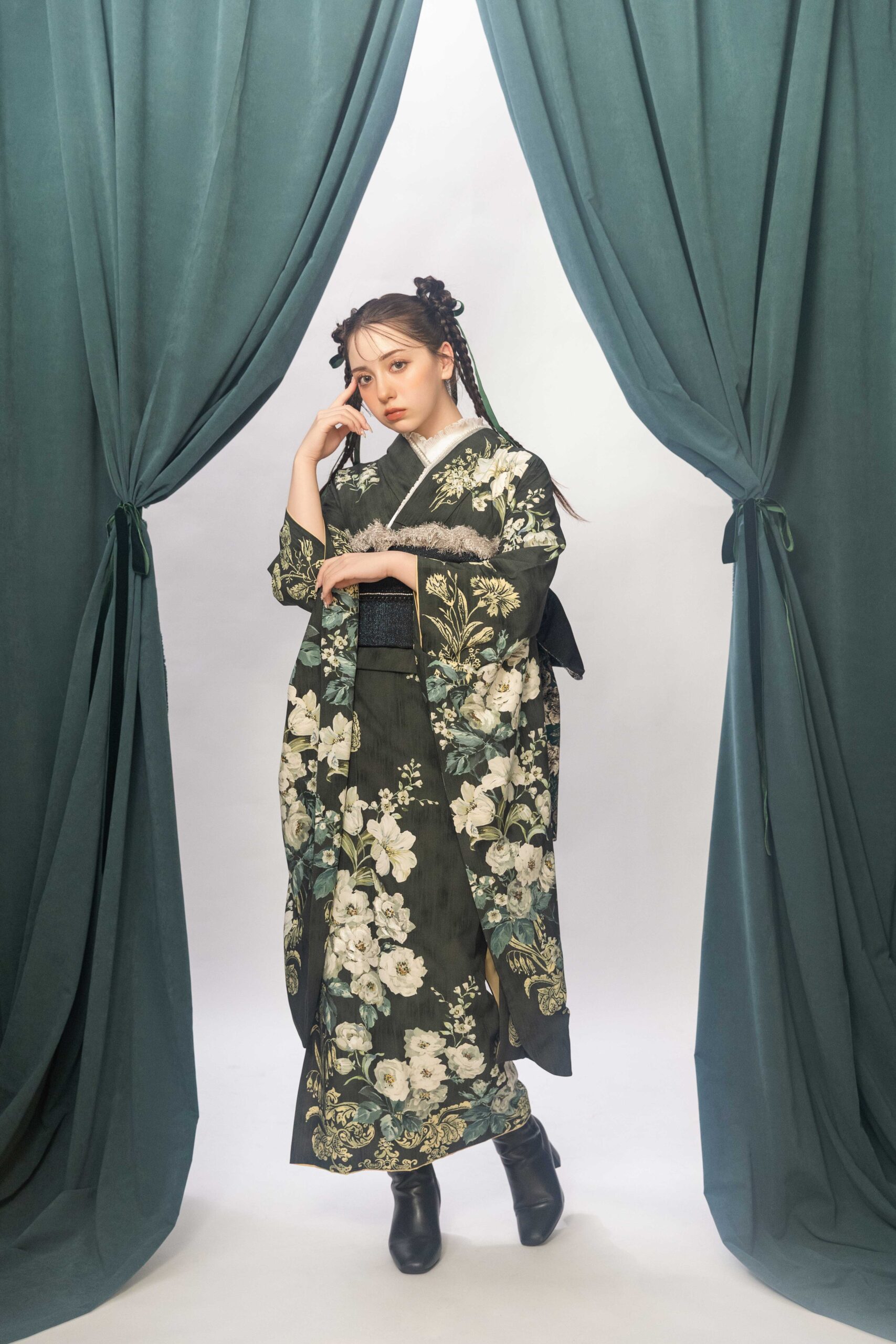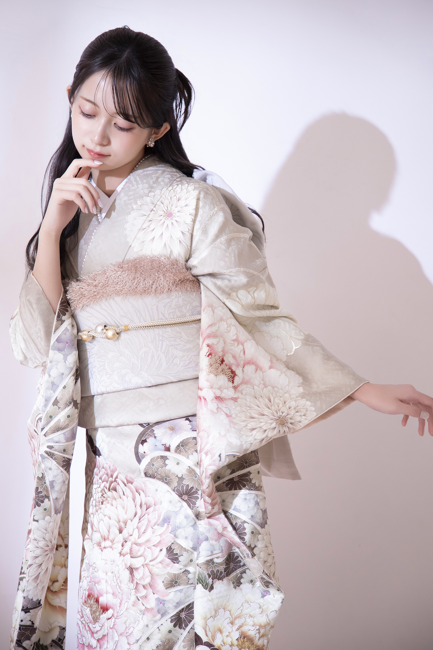 ぱれっとのアンティーク調のスタジオセットは、こうしたくすみカラーの振袖と相性抜群。