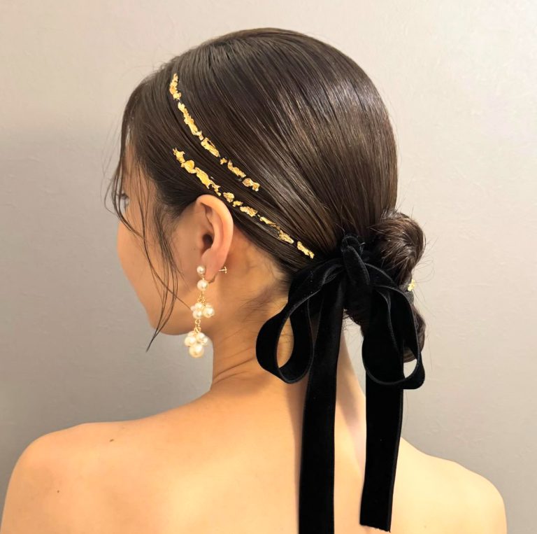 リボンやパールを毛束に絡ませたり、ヘアピンとしてプラスすると、ゲストとしての華やかさがぐっと増します。