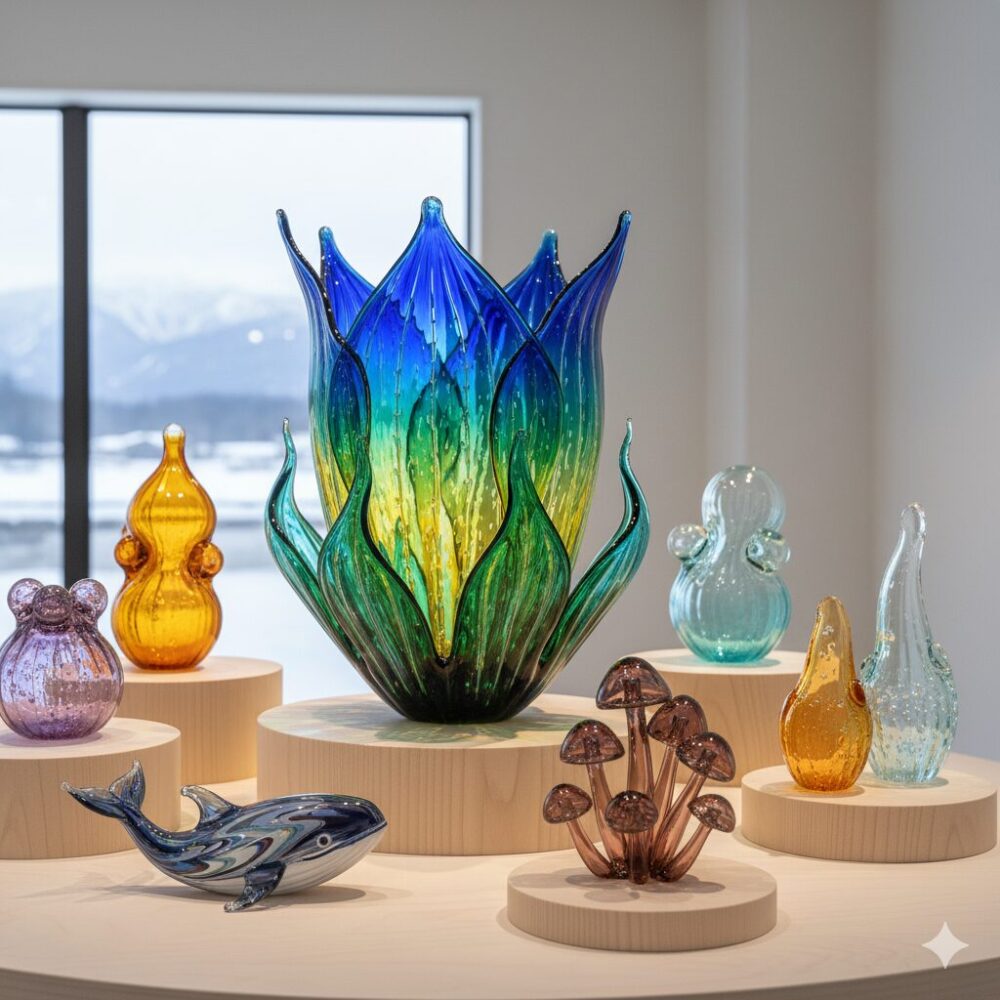 流氷硝子館では芸術的なガラス作品も堪能できます。