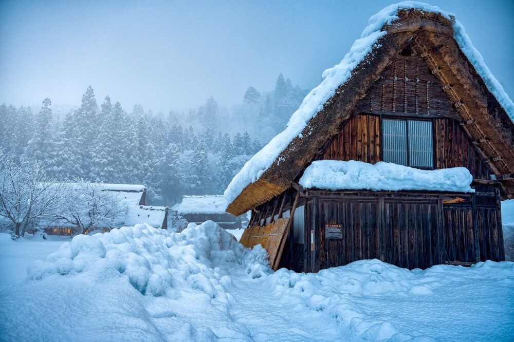 屋根に分厚く積もる雪、自然と融合した歴史的集落、心温まる伝統の暮らしが感じられます。