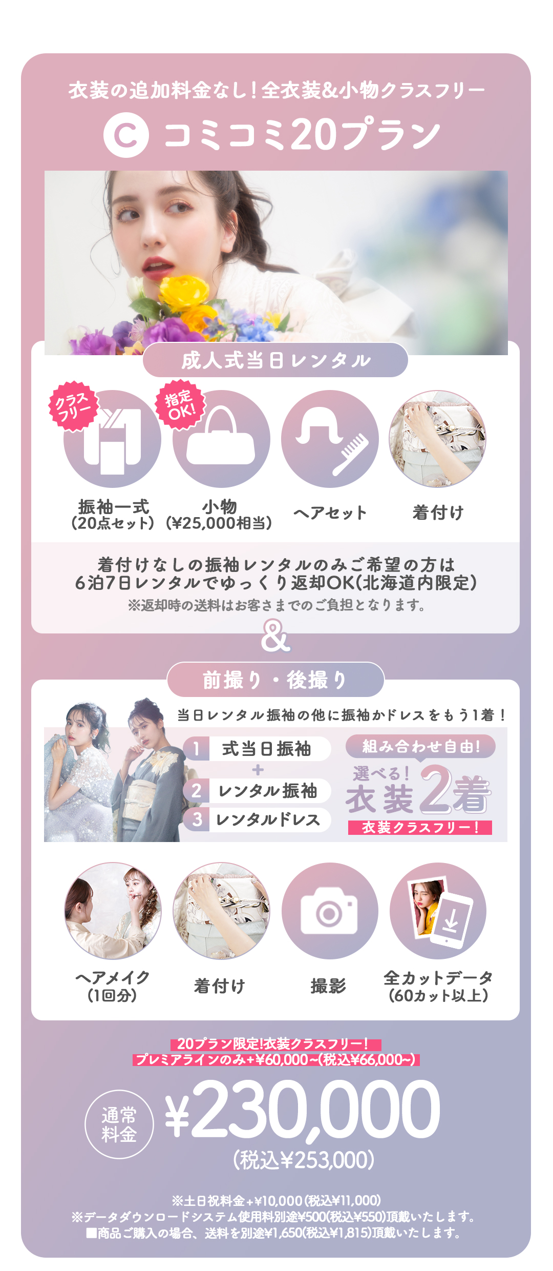 ・全部おまかせ「コミコミ」スタイル: 成人式当日の振袖レンタルと、前撮り撮影がセットになったプランが主流です。