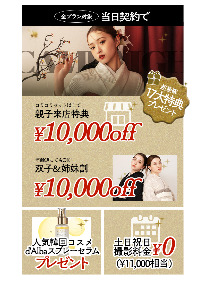 写真だけの成人式(前・後撮り)も、振袖レンタルも両方¥29,800(税込¥32,780)からご案内!