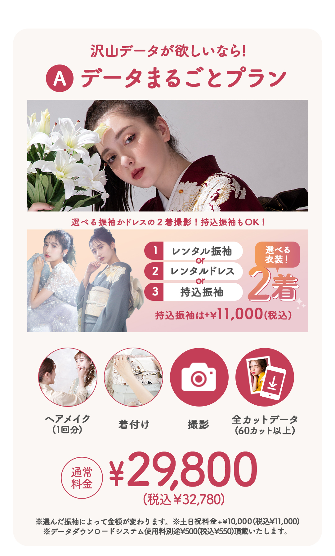 写真だけの成人式(前・後撮り)も、振袖レンタルも両方¥29,800(税込¥32,780)からご案内!