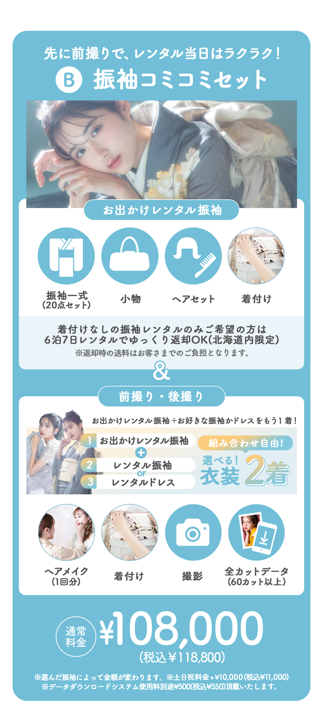 式当日の衣装も借りたい方には、前撮りと当日レンタルがセットになった「振袖コミコミセット」がおすすめです 。