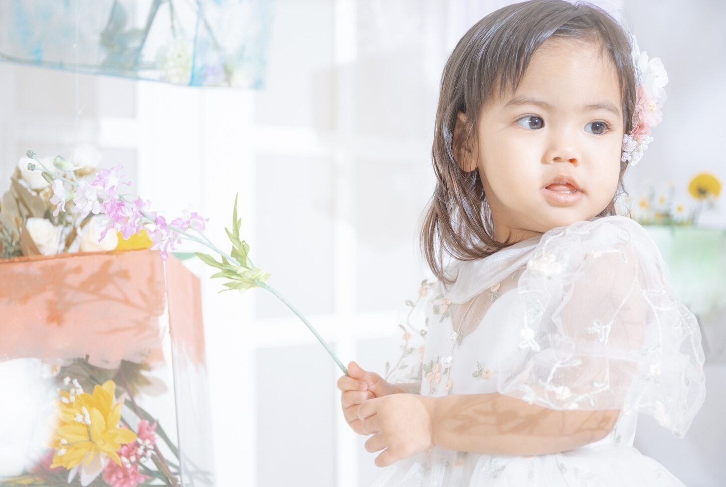 透明感あるフラワーボックスを背景に、お子様のピュア感溢れるお写真になります、、、♡