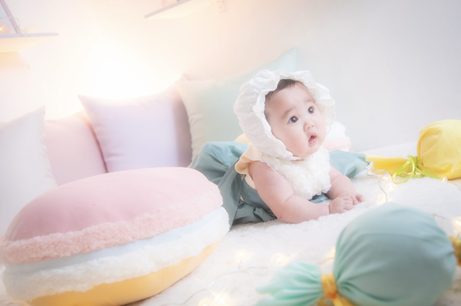 背景には柔らかなパステルカラーのクッションや絵本を配置し、