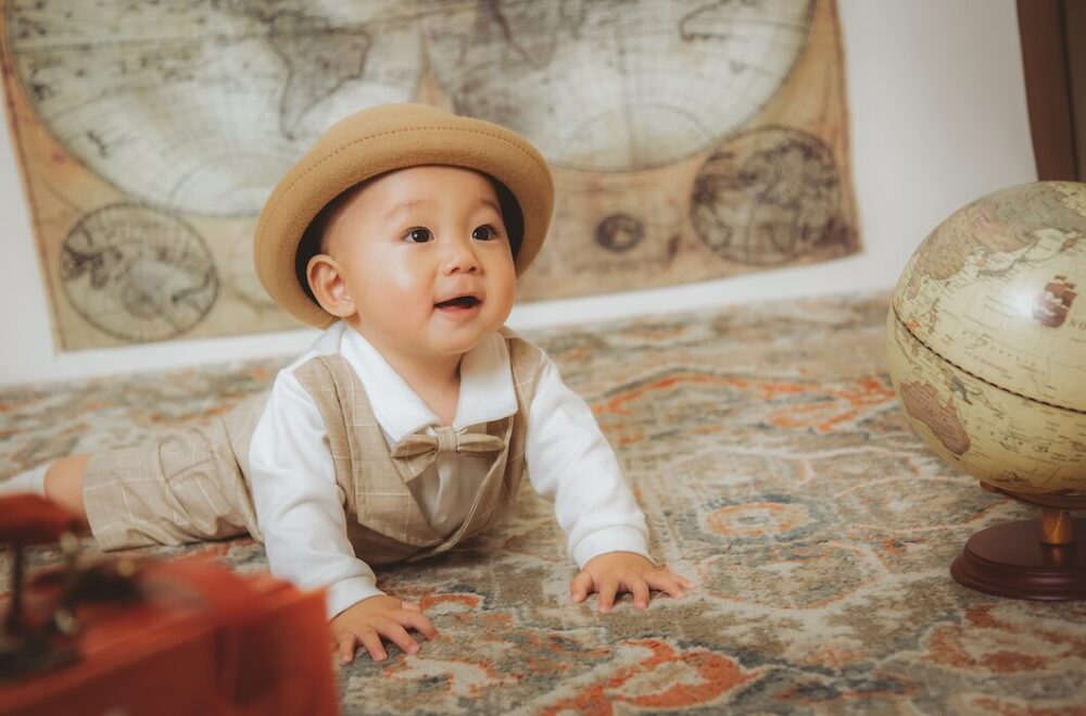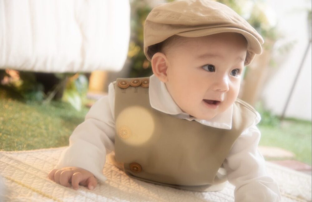 さらにキャスケット帽を合わせると、一気におしゃれ度アップ!海外風ベビーフォトのような仕上がりになり、SNS映えも間違いなしです。