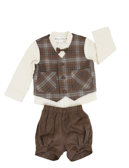 ブラウンチェック柄のベストに蝶ネクタイを合わせたコーディネートは、クラシックでありながら可愛らしさも残る絶妙なバランス。