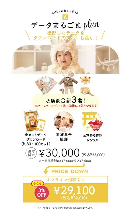 結論ファースト:オンライン相談での事前入金や、期間限定のキャンペーンを利用することで、お得に撮影できます 。