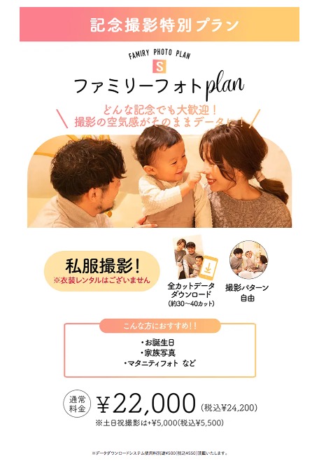このプランは、私服での撮影パターンが自由なので、家族みんなでリンクコーデを楽しみたい方や、手軽に記念を残したい方に最適です 。