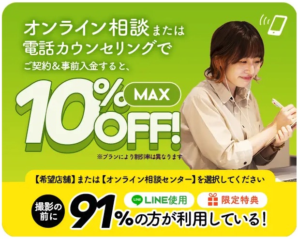 10%OFFのチャンス! ロケーションフォトの予約では、オンライン相談または電話カウンセリングでの決済を利用することで、10%OFFの特典が適用される可能性があります 。