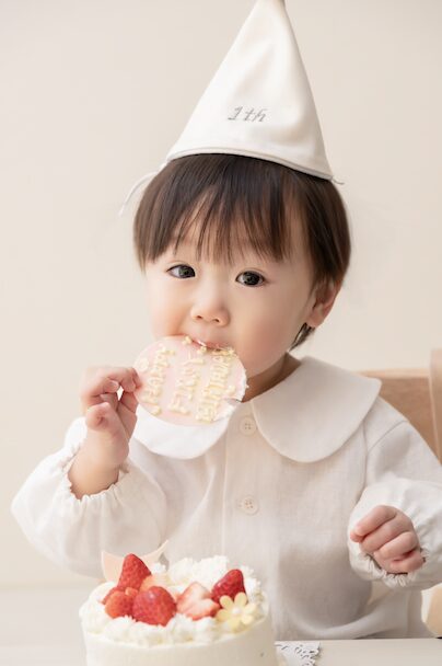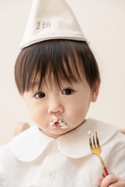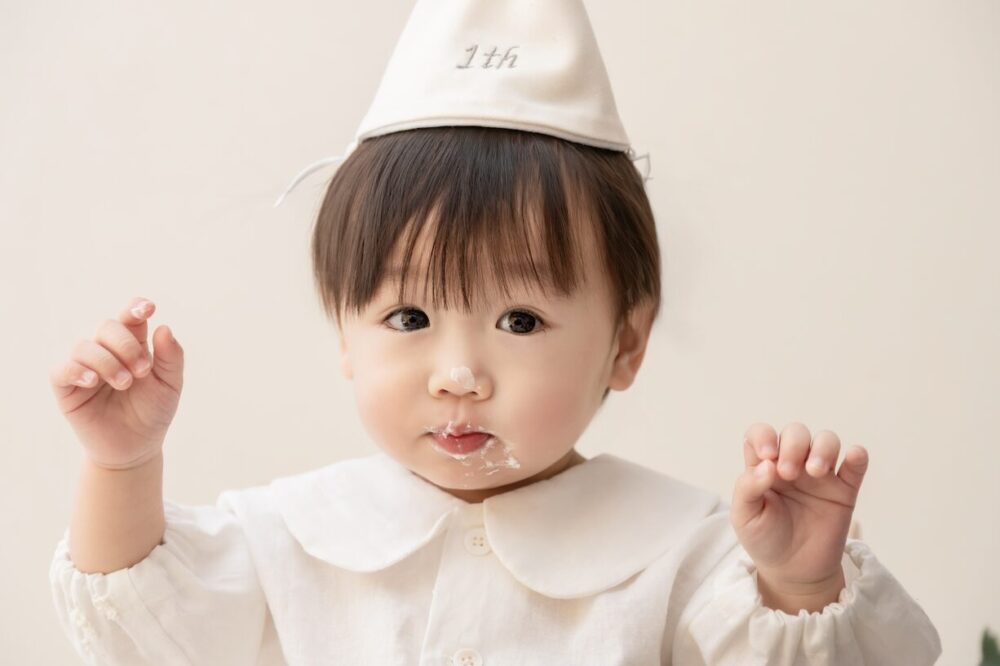 「上手に食べられるかな?」「どんな顔をするかな?」というパパママの期待をよそに、クリームを鼻につけたり、大胆に手で掴んだりする姿は、この時期ならではの無邪気さそのもの。写真工房ぱれっとでは、そんな**「今、この瞬間」の躍動感**を逃さずシャッターに収めます。