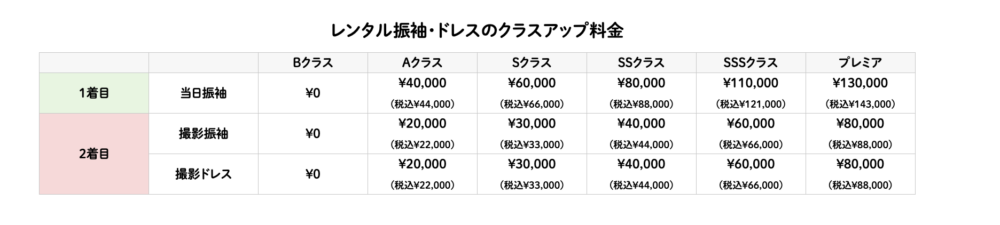 ぱれっとの振袖・ドレスは、クラスによって料金が異なります。基本プラン料金に加え、下記のクラスアップ料金が発生します。