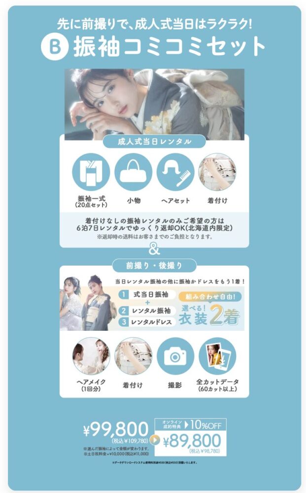 「B振袖コミコミセット」は、成人式当日のレンタルに加えて、撮影やヘアメイクまでセットになった充実プラン。